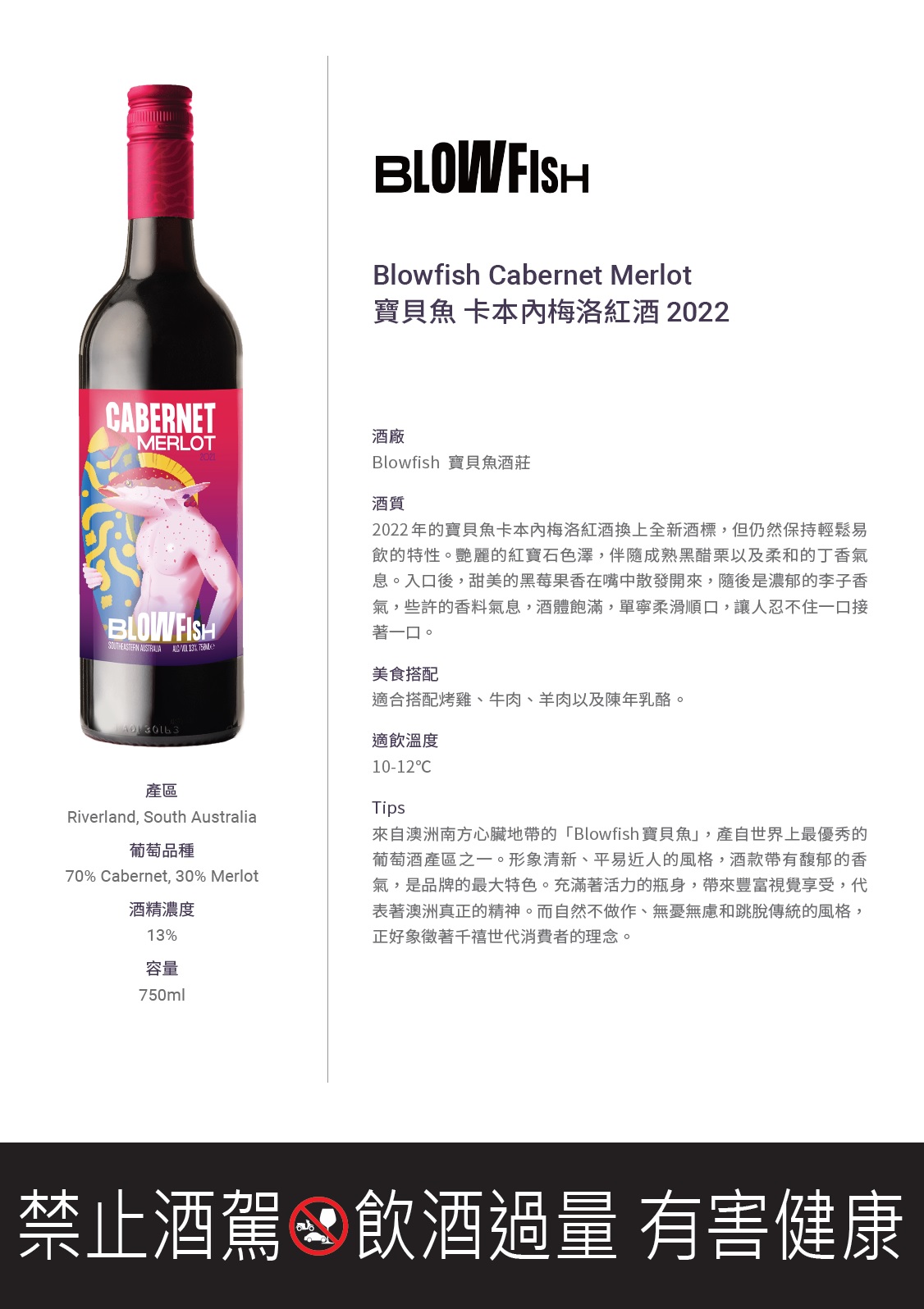來自澳洲南方心臟地帶的「Blowfish寶貝魚」,產自世界上最優秀的葡萄酒產區之一。形象清新、平易近人的風格,酒款帶有馥郁的香氣,是品牌的最大特色。充滿著活力的瓶身,帶來豐富視覺享受,代表著澳洲真正的精神。而自然不做作、無憂無慮和跳脫傳統的風格,正好象徵著千禧世代消費者的理念。