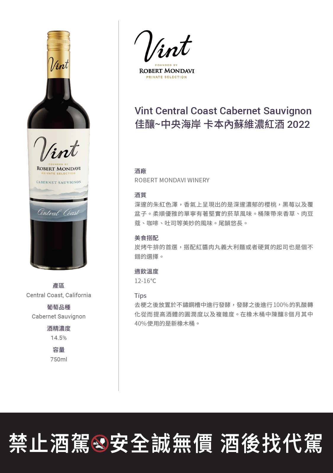 Robert Mondavi Vint Central Coast Cabernet Sauvignon 羅伯蒙岱維 佳釀 中央海岸 卡本內蘇維濃 紅酒
