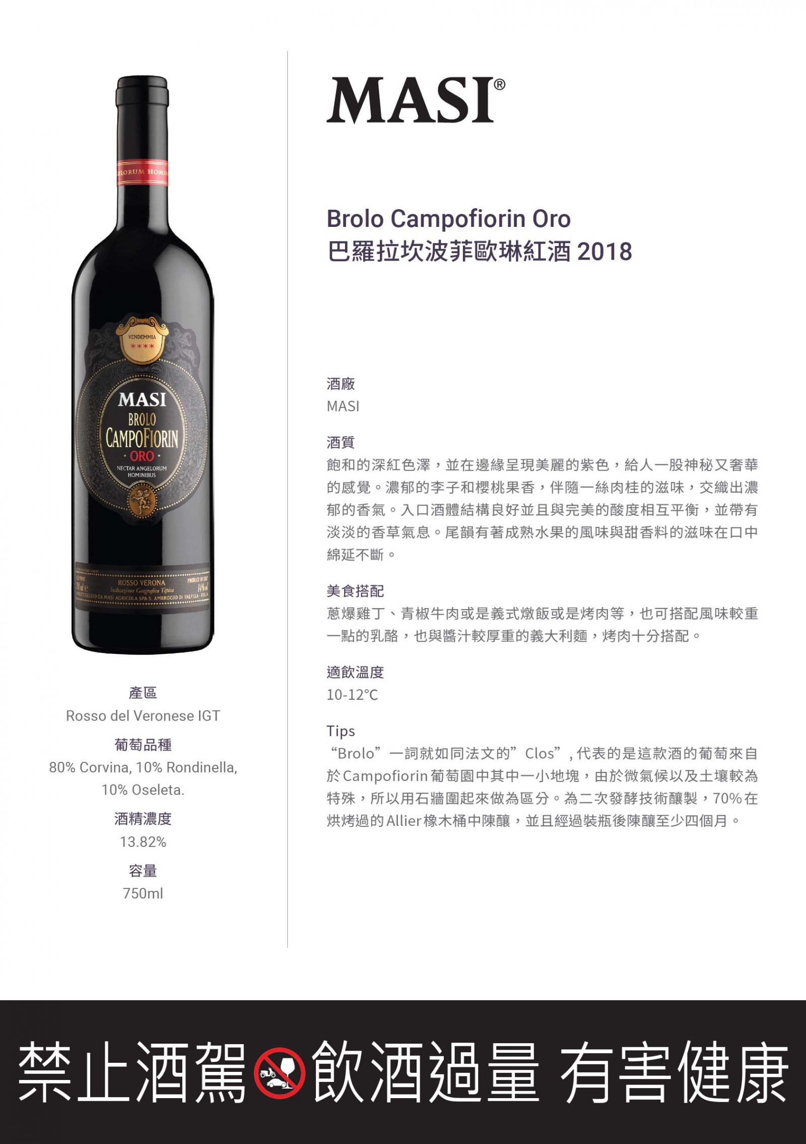 “Brolo”一詞就如同法文的”Clos”, 代表的是這款酒的葡萄來自於 Campofiorin 葡萄園中其中一小地塊,由於微氣候以及土壤較為特殊,所以用石牆圍起來做為區分。為二次發酵技術釀製,70% 在烘烤過的 Allier 橡木桶中陳釀,並且經過裝瓶後陳釀至少四個月。