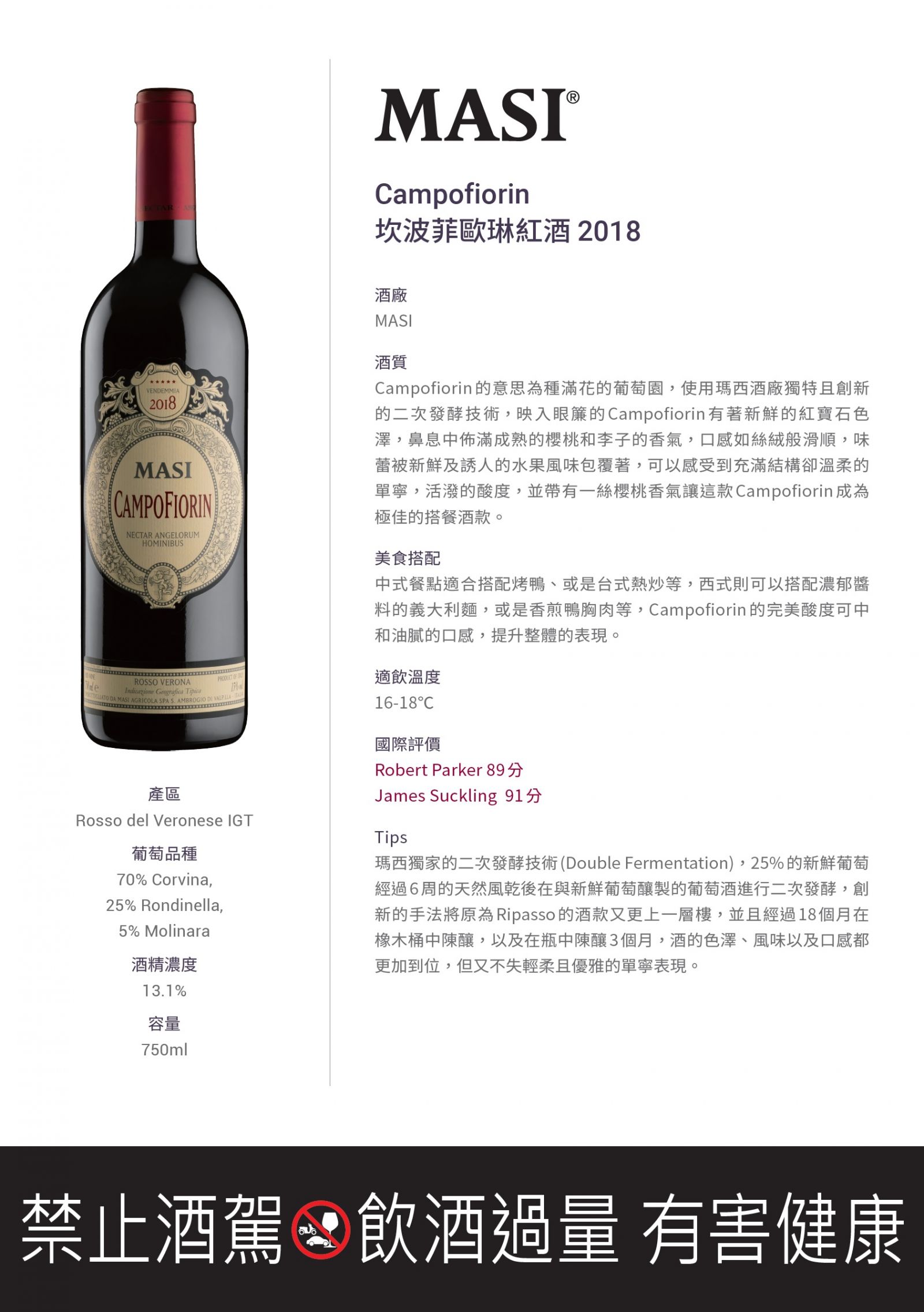 Campofiorin 的意思為種滿花的葡萄園,使用瑪西酒廠獨特且創新的二次發酵技術,映入眼簾的 Campofiorin 有著新鮮的紅寶石色澤,鼻息中佈滿成熟的櫻桃和李子的香氣,口感如絲絨般滑順,味蕾被新鮮及誘人的水果風味包覆著,可以感受到充滿結構卻溫柔的單寧,活潑的酸度,並帶有一絲櫻桃香氣讓這款 Campofiorin 成為極佳的搭餐酒款。