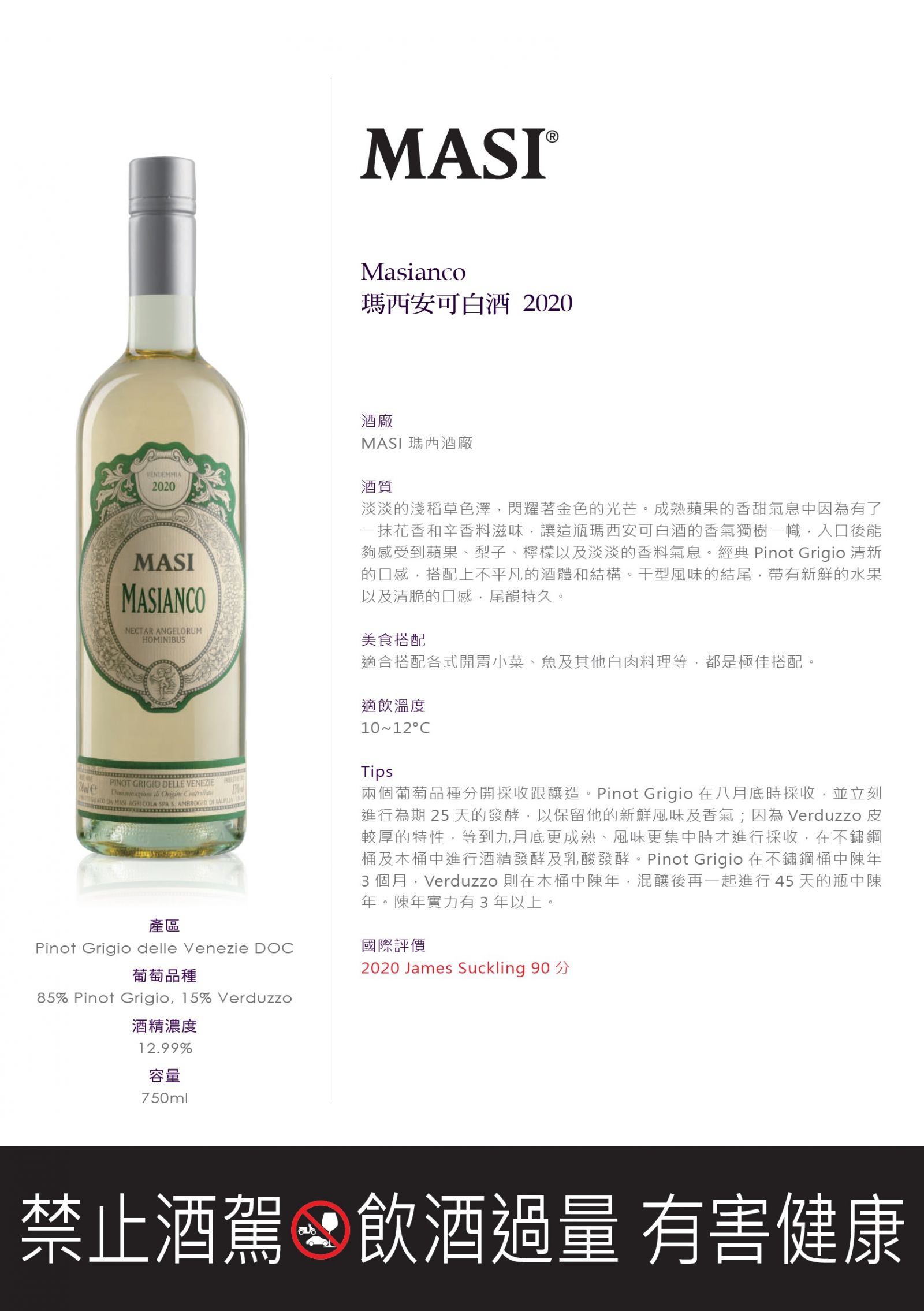 守護義大利原生根種,承襲釀造精神,MASI酒廠被稱為義大利最具代表性的酒款,Amarone風乾葡萄酒專家,擁有義大利Veneto Valpolicella知名酒鄉多處的優質葡萄園,長時間的天然風乾法,並釀造出義大利第一款使用風乾葡萄的白酒Masianco。酒莊多次入選義大利紅蝦評鑑最高榮譽三杯獎,已成為義大利最具影響力的酒莊之一。