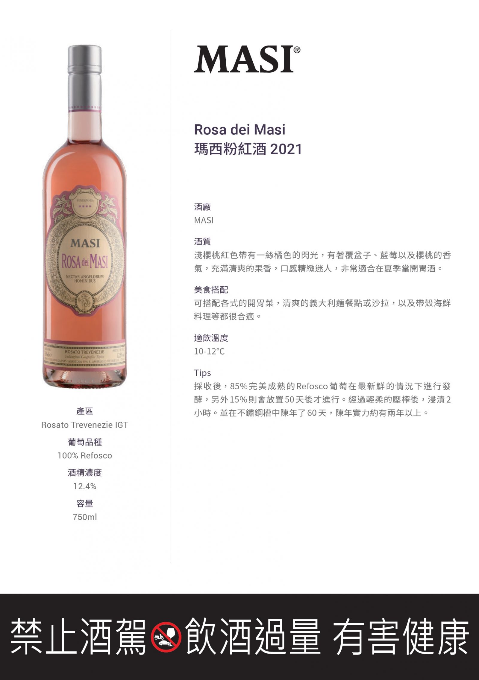 守護義大利原生根種,承襲釀造精神,MASI酒廠被稱為義大利最具代表性的酒款,Amarone風乾葡萄酒專家,擁有義大利Veneto Valpolicella知名酒鄉多處的優質葡萄園,長時間的天然風乾法,並釀造出義大利第一款使用風乾葡萄的白酒Masianco。酒莊多次入選義大利紅蝦評鑑最高榮譽三杯獎,已成為義大利最具影響力的酒莊之一。