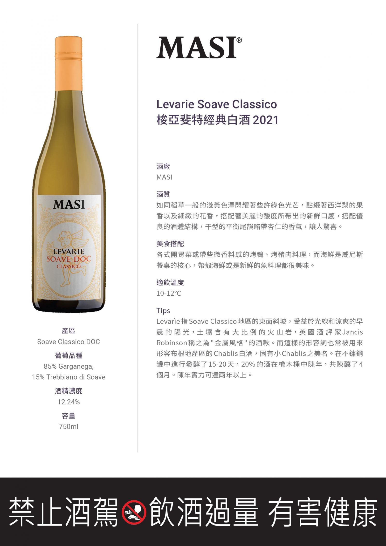 Levarìe 指 Soave Classico 地區的東面斜坡,受益於光線和涼爽的早晨的陽光,土壤含有大比例的火山岩,英國酒評家Jancis Robinson 稱之為 " 金屬風格 " 的酒款。而這樣的形容詞也常被用來形容布根地產區的 Chablis 白酒,固有小Chablis 之美名。在不鏽鋼罐中進行發酵了 15-20 天,20% 的酒在橡木桶中陳年,共陳釀了 4 個月。陳年實力可達兩年以上。