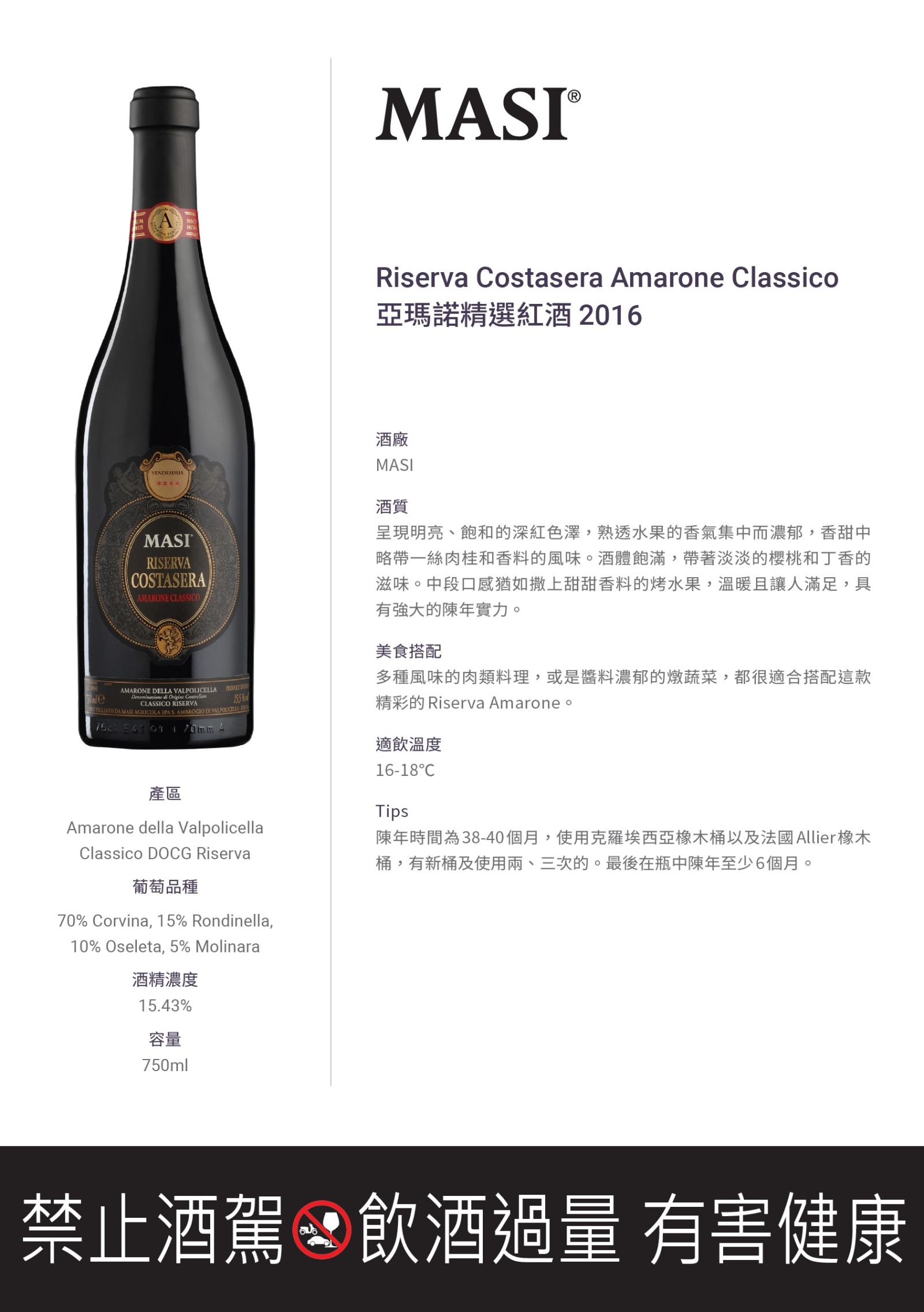 守護義大利原生根種,承襲釀造精神,MASI酒廠被稱為義大利最具代表性的酒款,Amarone風乾葡萄酒專家,擁有義大利Veneto Valpolicella知名酒鄉多處的優質葡萄園,長時間的天然風乾法,並釀造出義大利第一款使用風乾葡萄的白酒Masianco。酒莊多次入選義大利紅蝦評鑑最高榮譽三杯獎,已成為義大利最具影響力的酒莊之一。